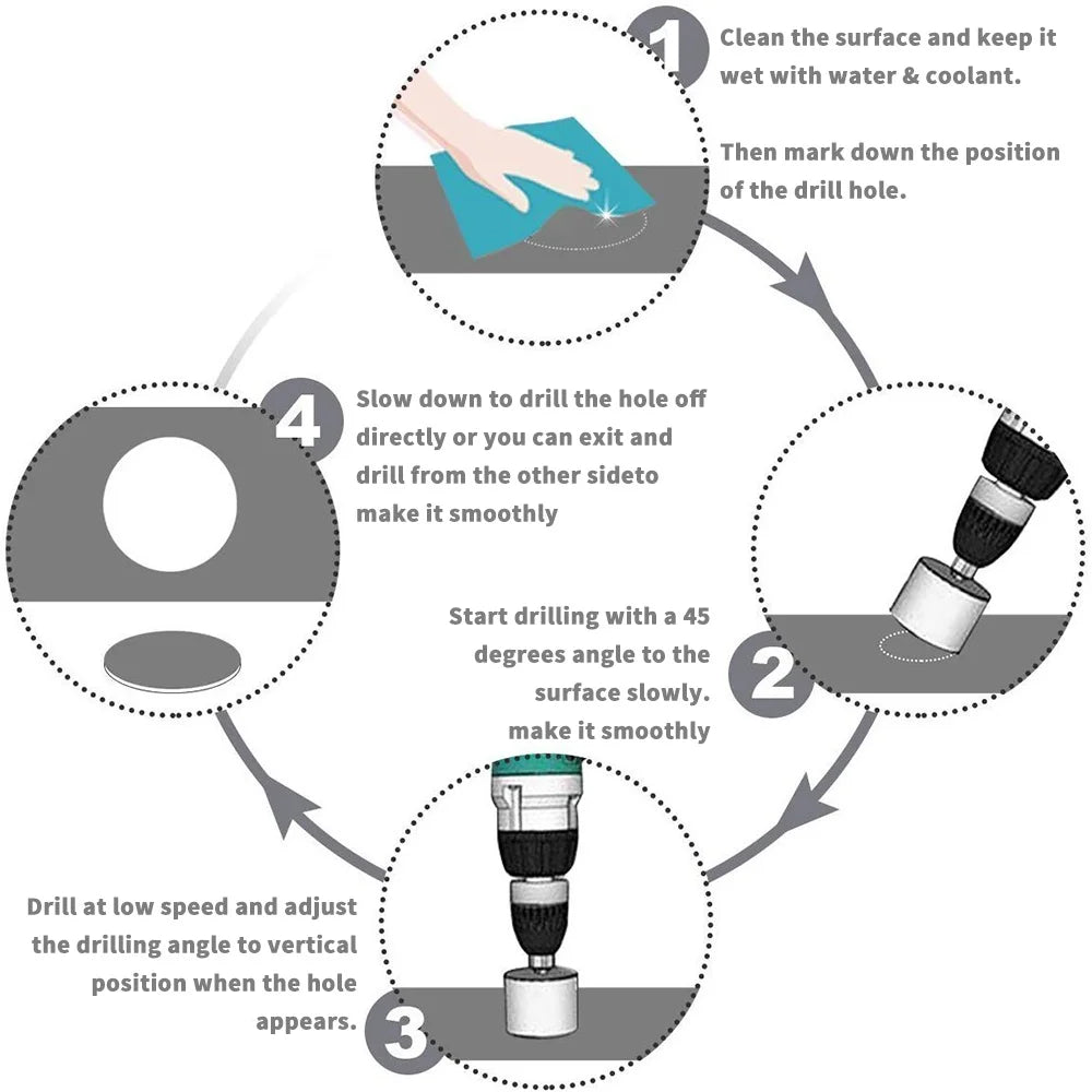 Simply attach to your drill, add a bit of water for cooling, and drill at low speed for best results.