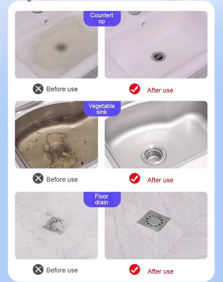 🧼 Powerful Cleaning Formula – Breaks down grease and food waste fast, restoring smooth water flow in minutes.